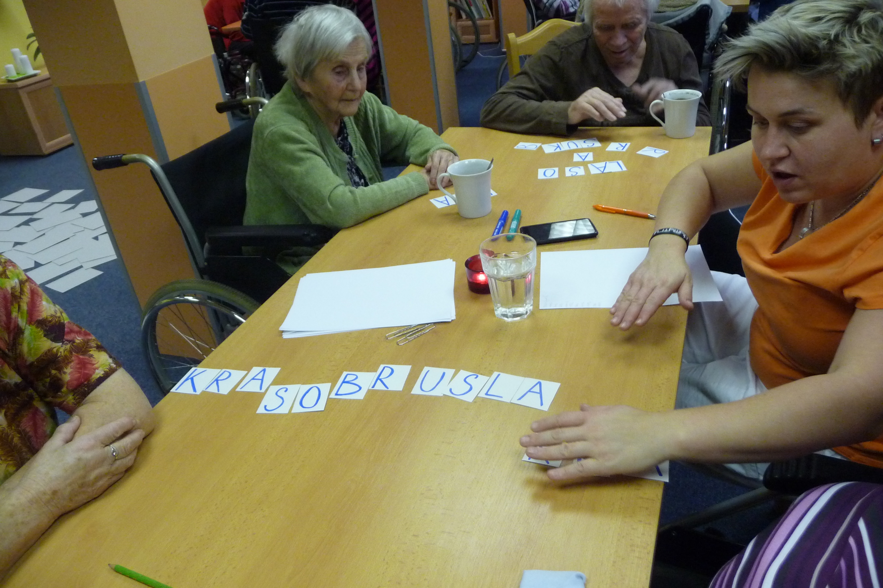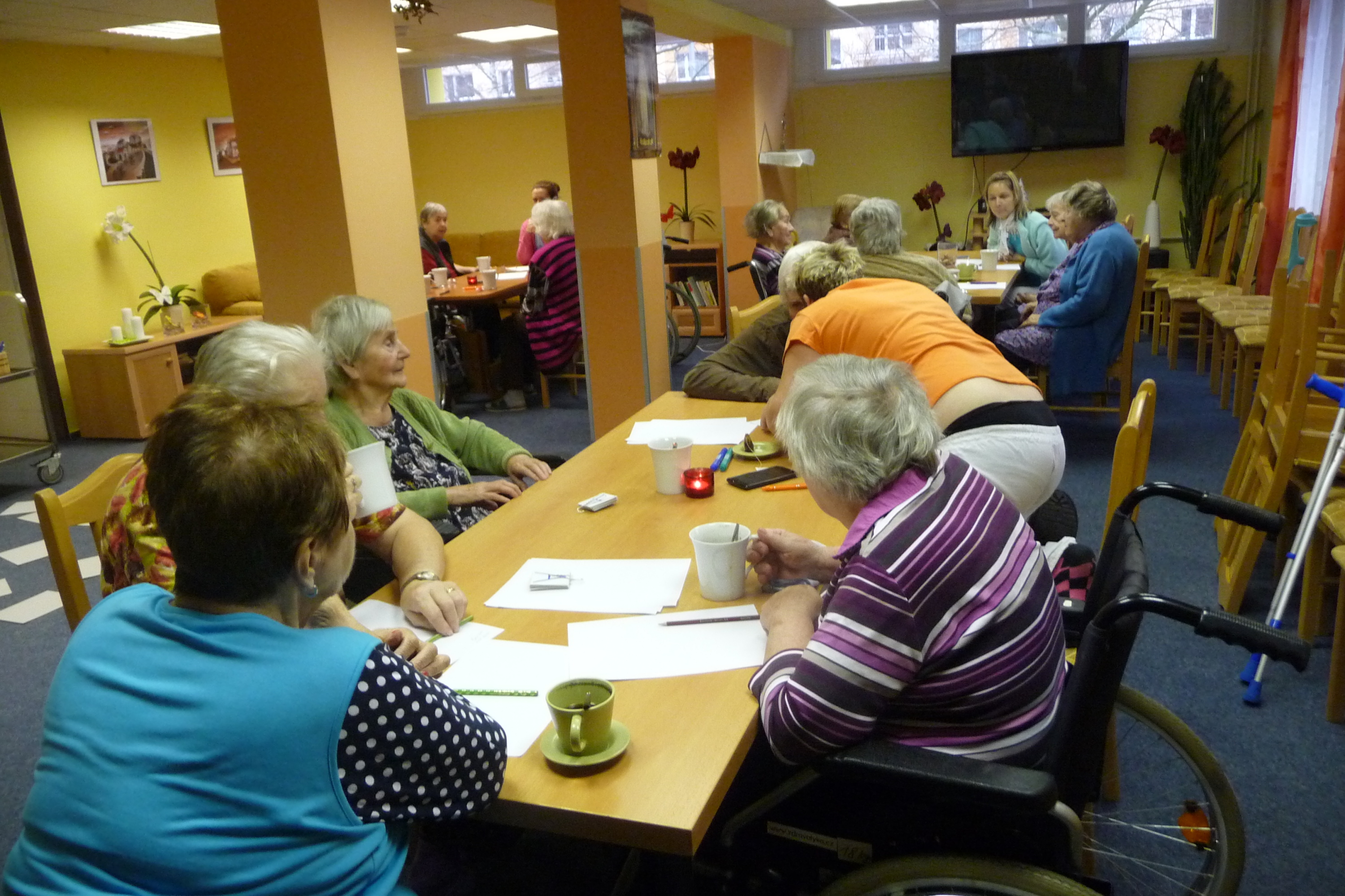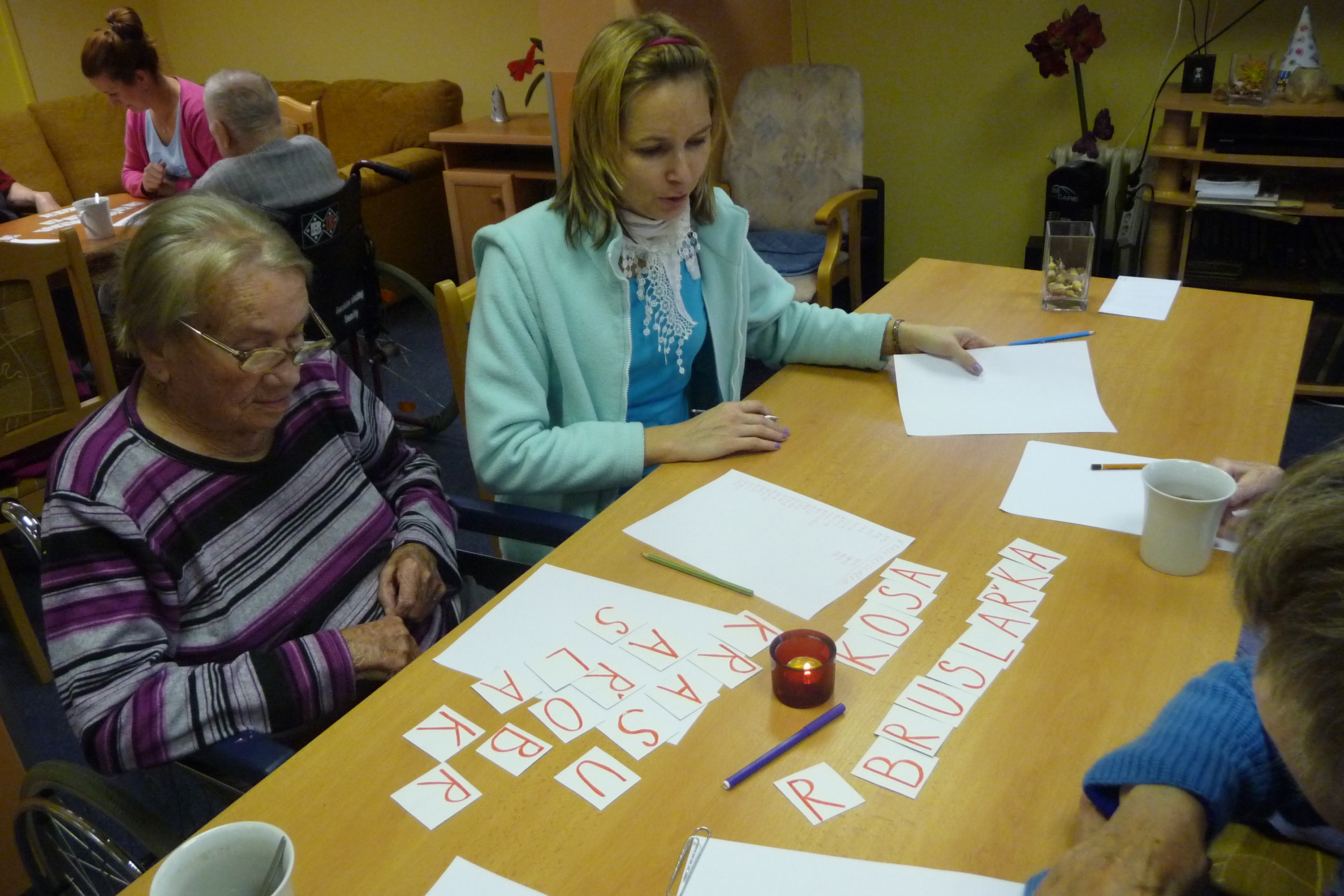 Poslední trénování paměti proběhlo opět v kulturní místnosti. Všichni účastníci, kteří se rozdělili do tří skupinek, plnili různé úkoly, tvořili slova ze zadaných písmen, vzpomínali na vánoční zvyklosti a snažili se vypsat všechny zimní sporty. Příjemnou tečkou byla opět hra bingo.