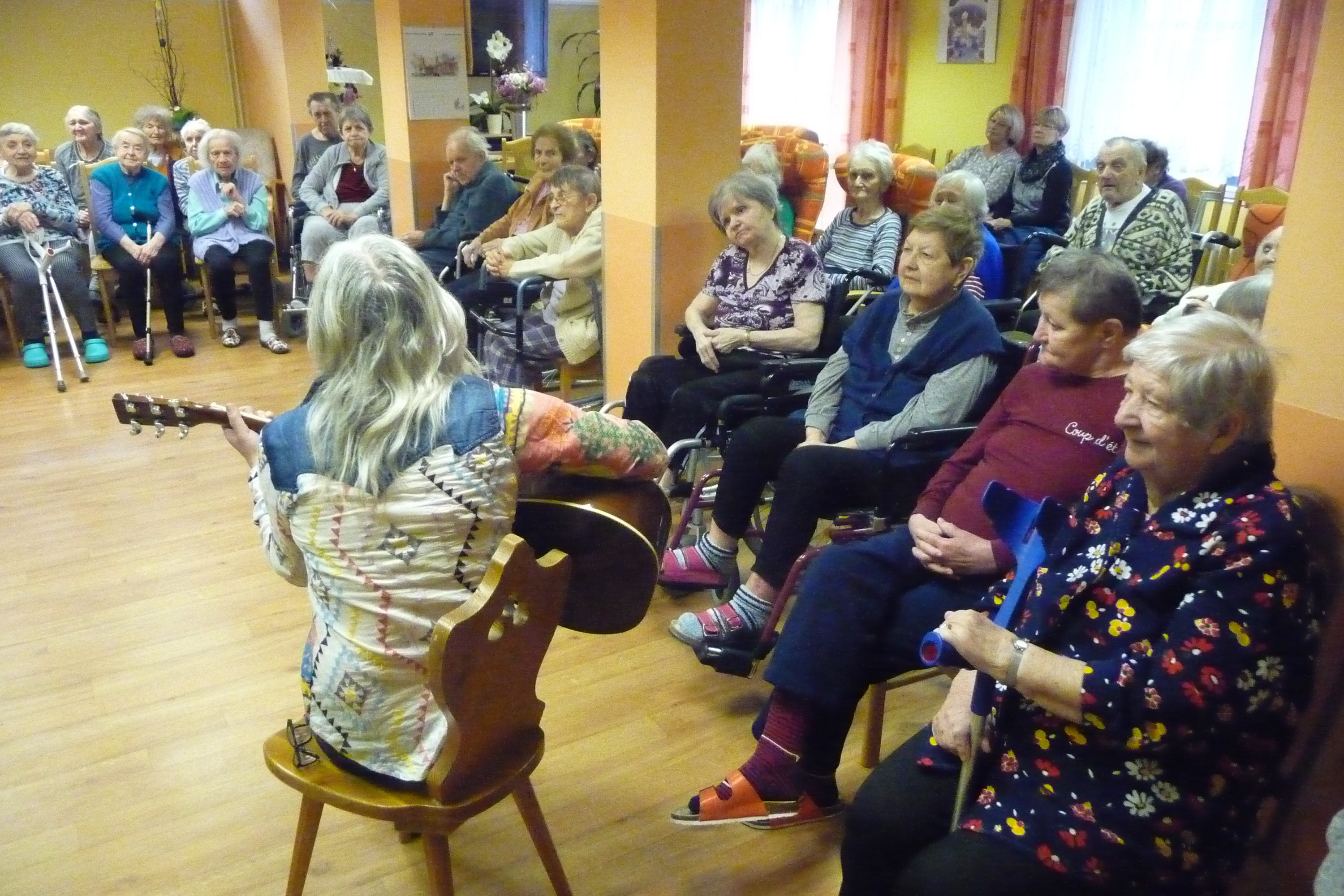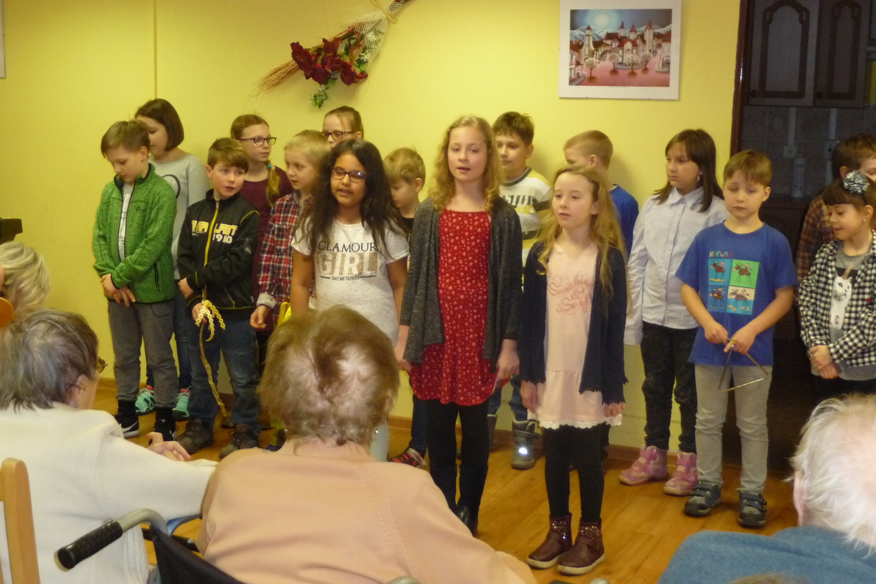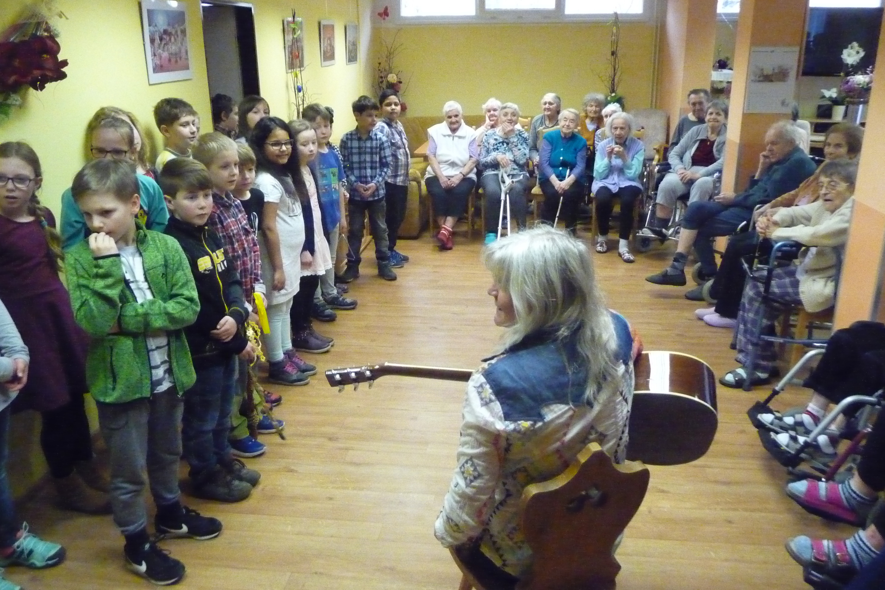 Ve středu 28. března dopoledne nás potěšili svým vystoupením žáčci ze ZŠ Dr. Fr. L. Riegra, kteří u nás zpívali i tančili.