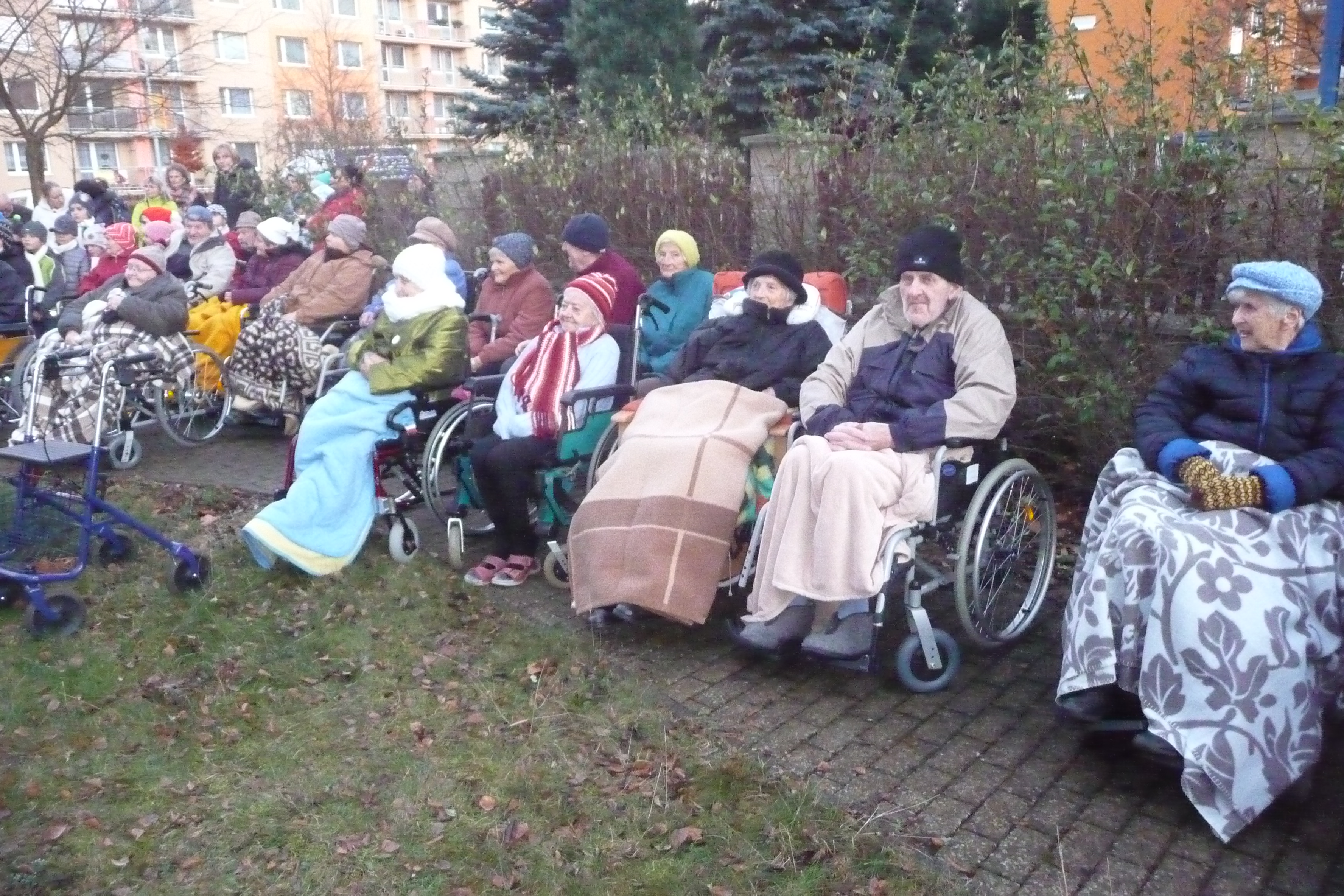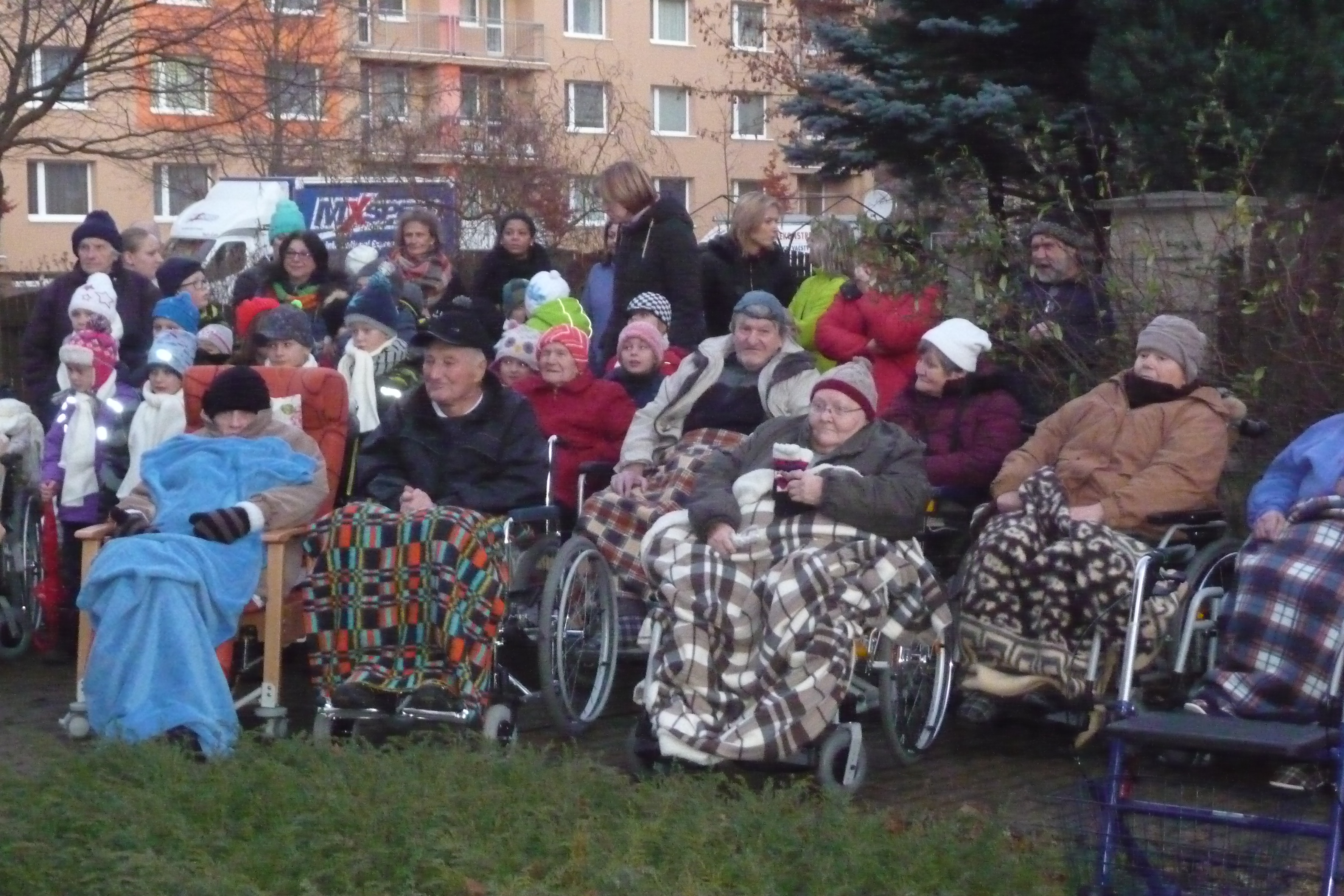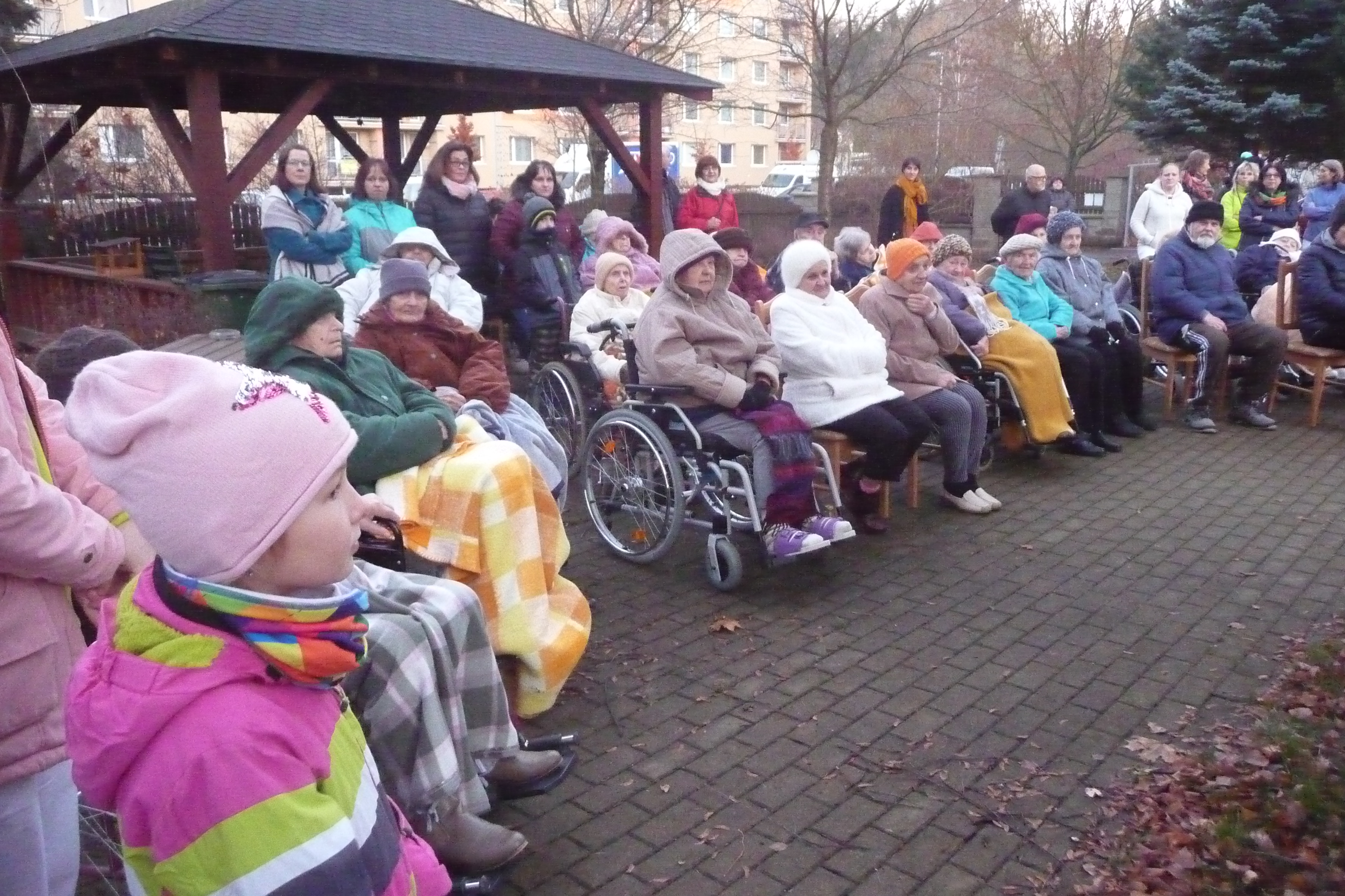 V úterý 4. prosince se na zahradě našeho domova měl poprvé rozsvít vánoční strom. Ve čtyři hodiny odpoledne - počasí se naštěstí umoudřilo - jsme se sešli na zahradě, kde byl připraven program, děti zpívaly krásnou písničku, Kokrháček známé koledy, Anička hrála na flétnu a krásnou tečkou byla Tichá noc v podání Lindy Chrisové, která hrála na klarinet. Vánoční punč a prskavky doladily atmosféru. A nakonec rozsvícení stromečku, které odpočítala paní starostka Lena Mlejnková s dětmi, pro nás zahájilo adventní čas.