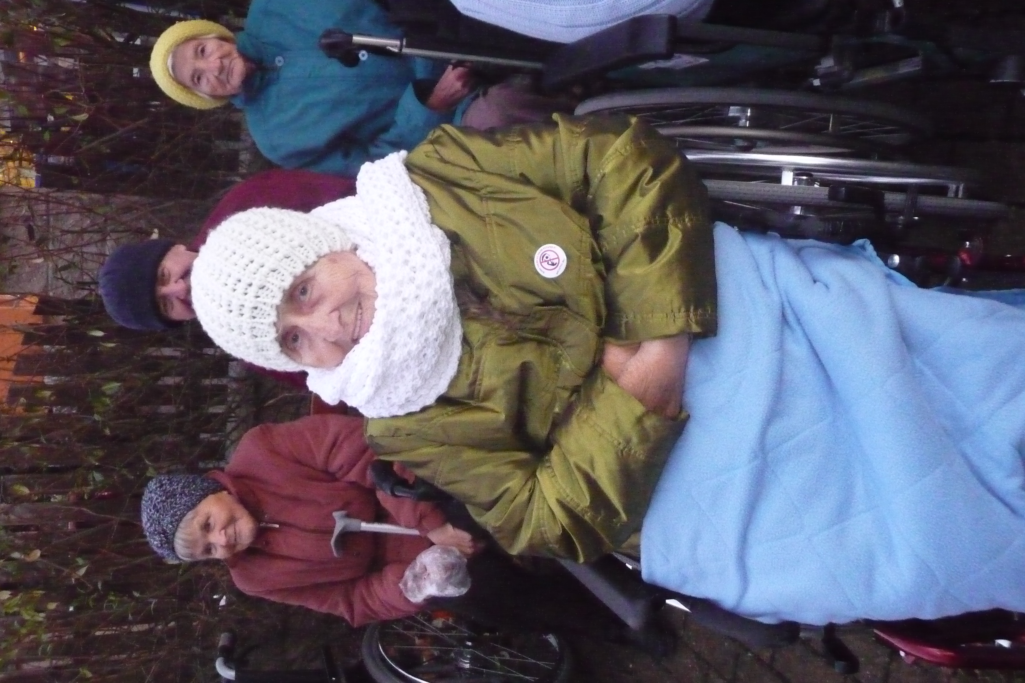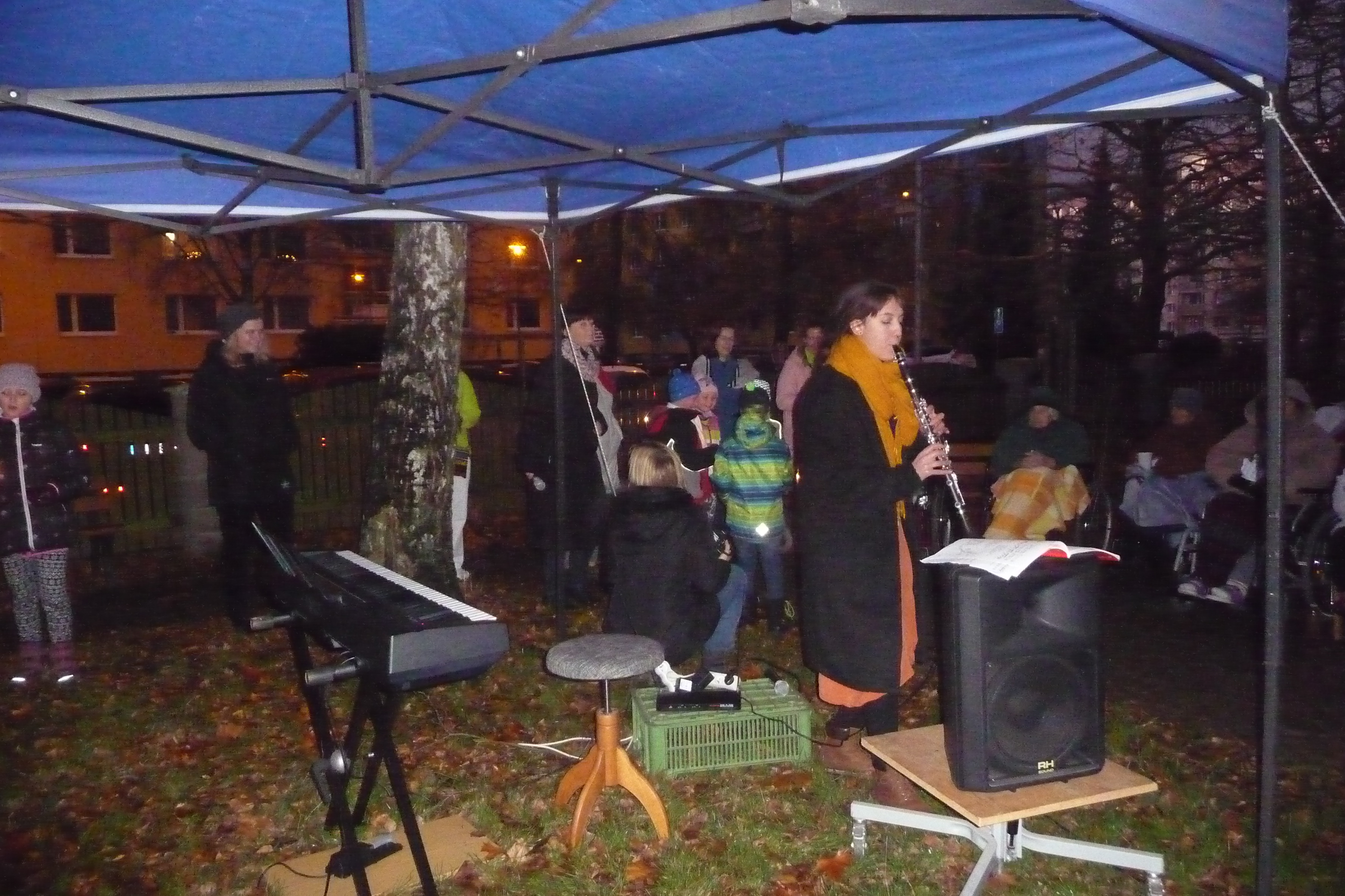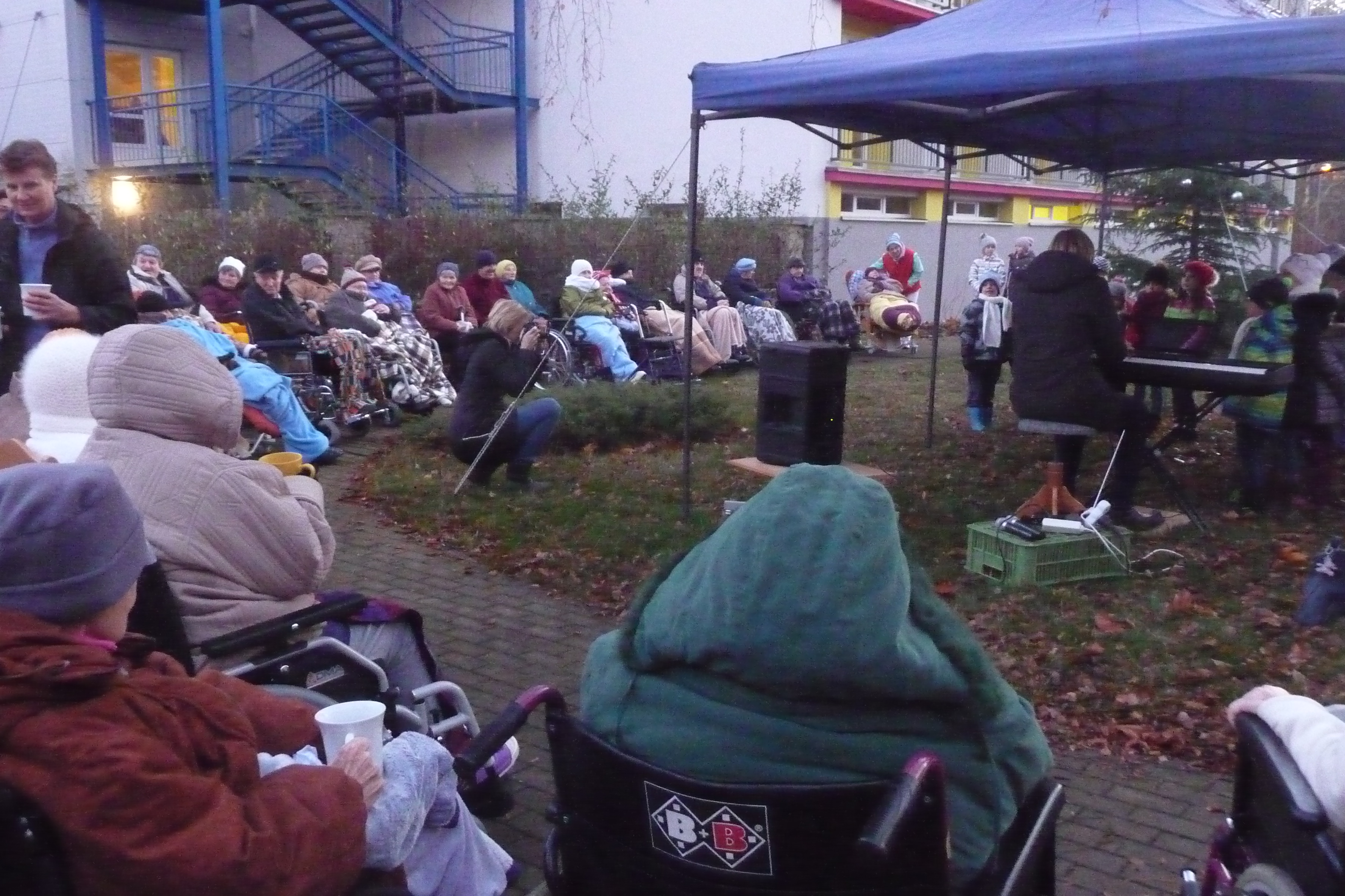 V úterý 4. prosince se na zahradě našeho domova měl poprvé rozsvít vánoční strom. Ve čtyři hodiny odpoledne - počasí se naštěstí umoudřilo - jsme se sešli na zahradě, kde byl připraven program, děti zpívaly krásnou písničku, Kokrháček známé koledy, Anička hrála na flétnu a krásnou tečkou byla Tichá noc v podání Lindy Chrisové, která hrála na klarinet. Vánoční punč a prskavky doladily atmosféru. A nakonec rozsvícení stromečku, které odpočítala paní starostka Lena Mlejnková s dětmi, pro nás zahájilo adventní čas.