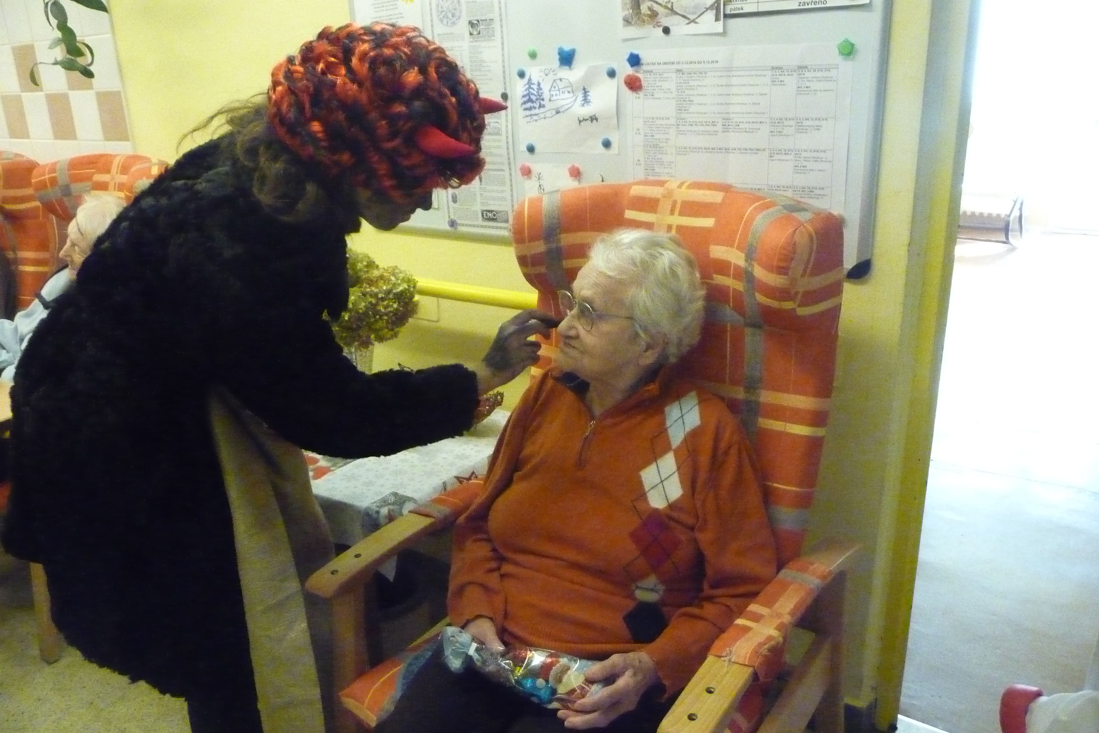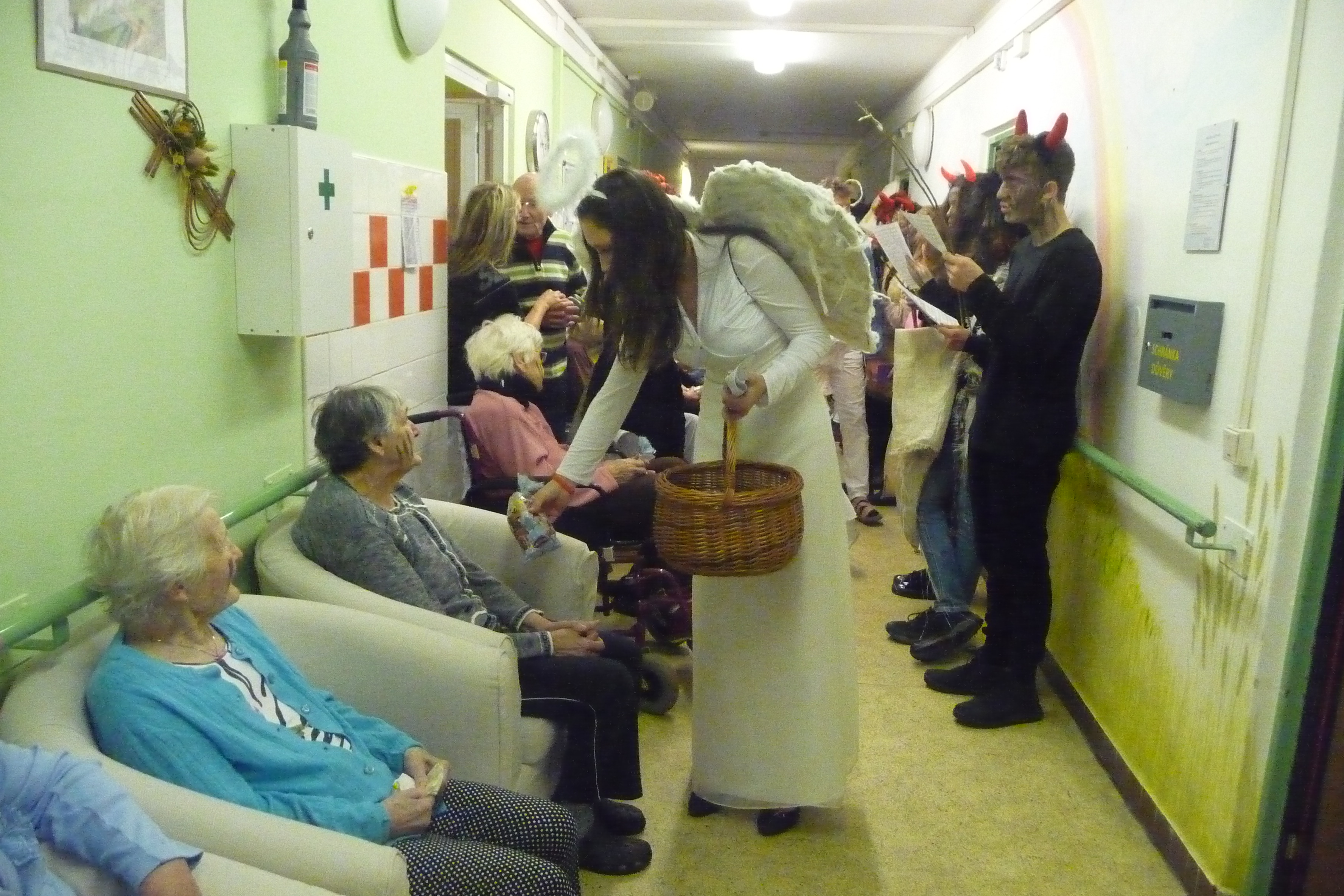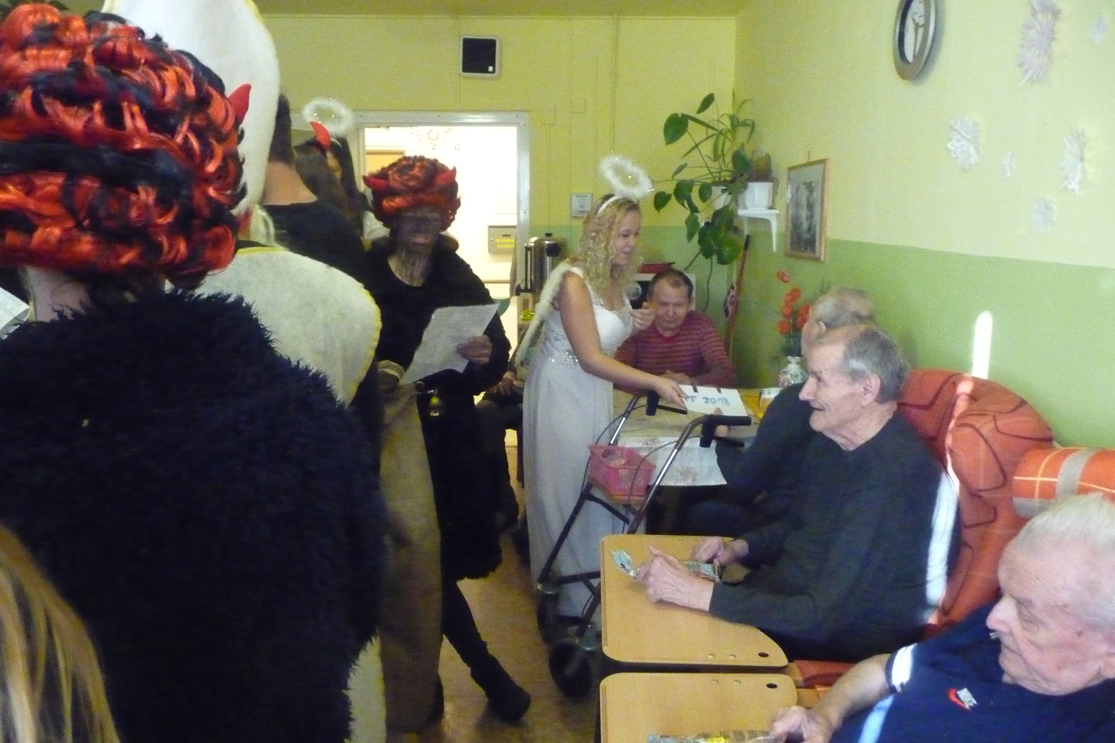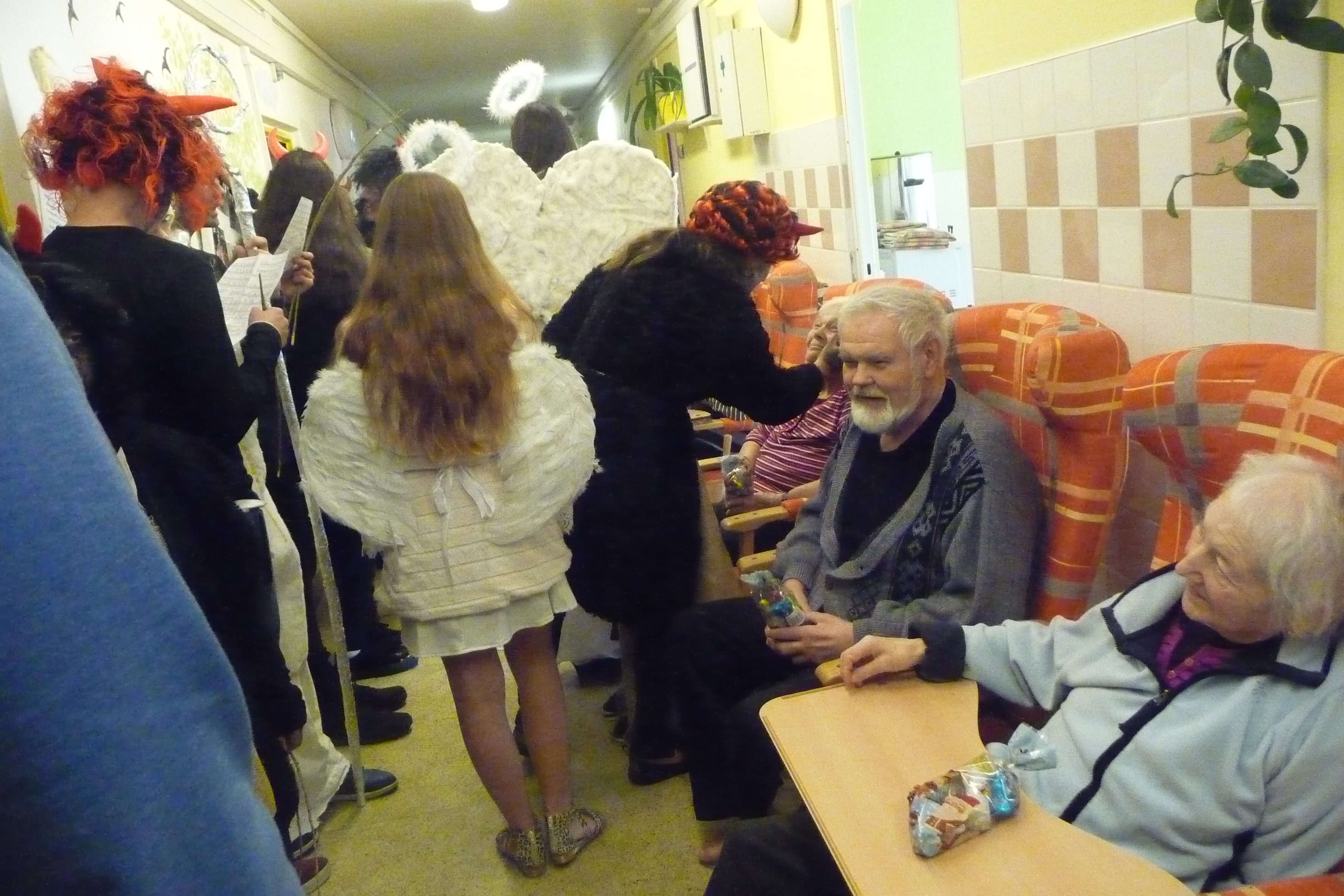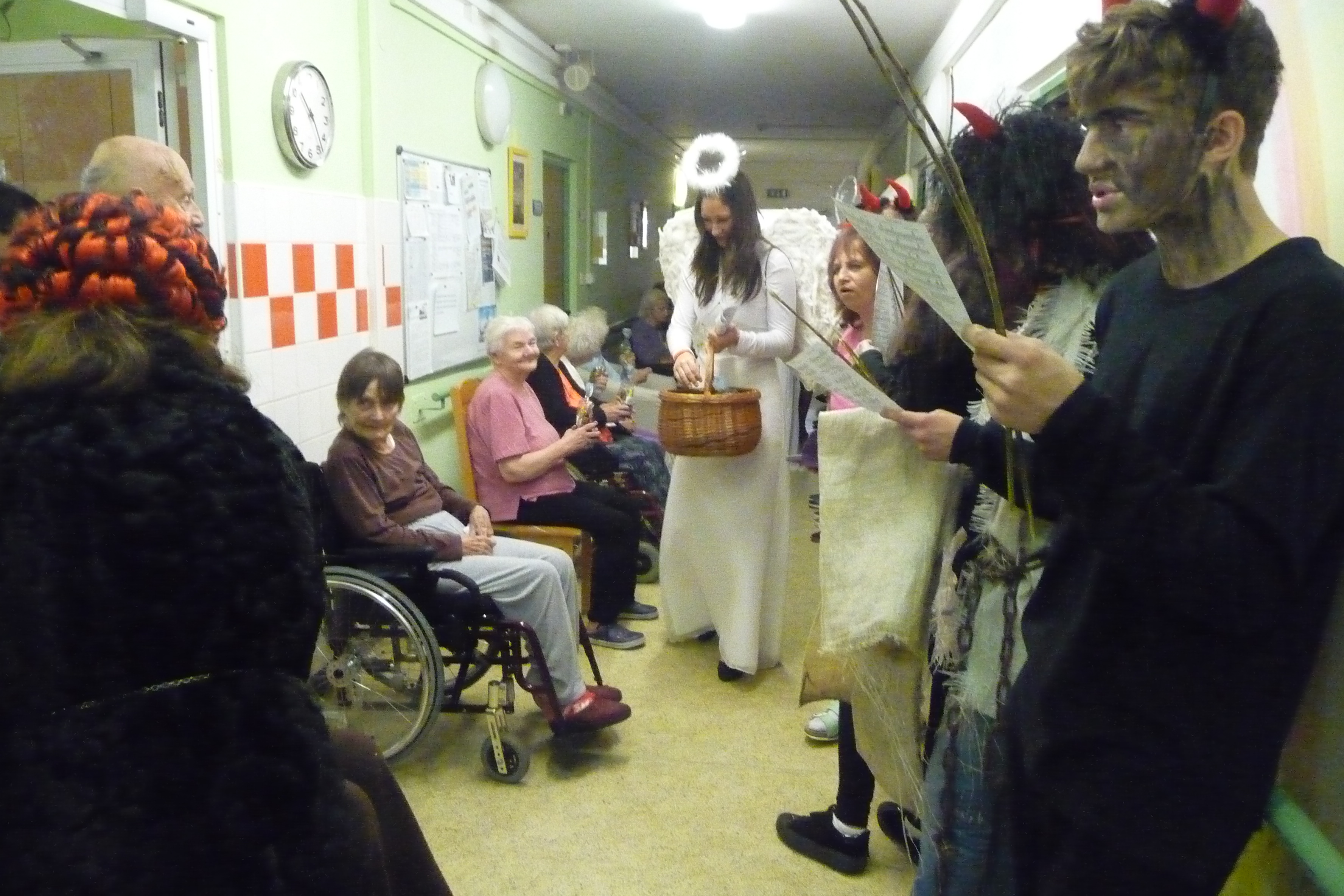Jaký každý rok i dnes jsme se dočkali návštěvy těch, kterých se někteří velmi bojí :-) U nás tomu ale tak nebylo! V celém domově všichni čekali na průvod čertů a andílků v čele s Mikulášem. Dvě skupiny zamaskovaných žáků devátých tříd ze ZŠ Dr. Fr. L. Riegra prošly celý dům, zastavili se u každého, popřáli krásné svátky, předali balíček s dobrotami a vlastnoruční přáníčko. Navštívili také ty, kteří je nemohli vyhlížet na chodbě. Celý průvod provázeli veselé písničky a koledy...