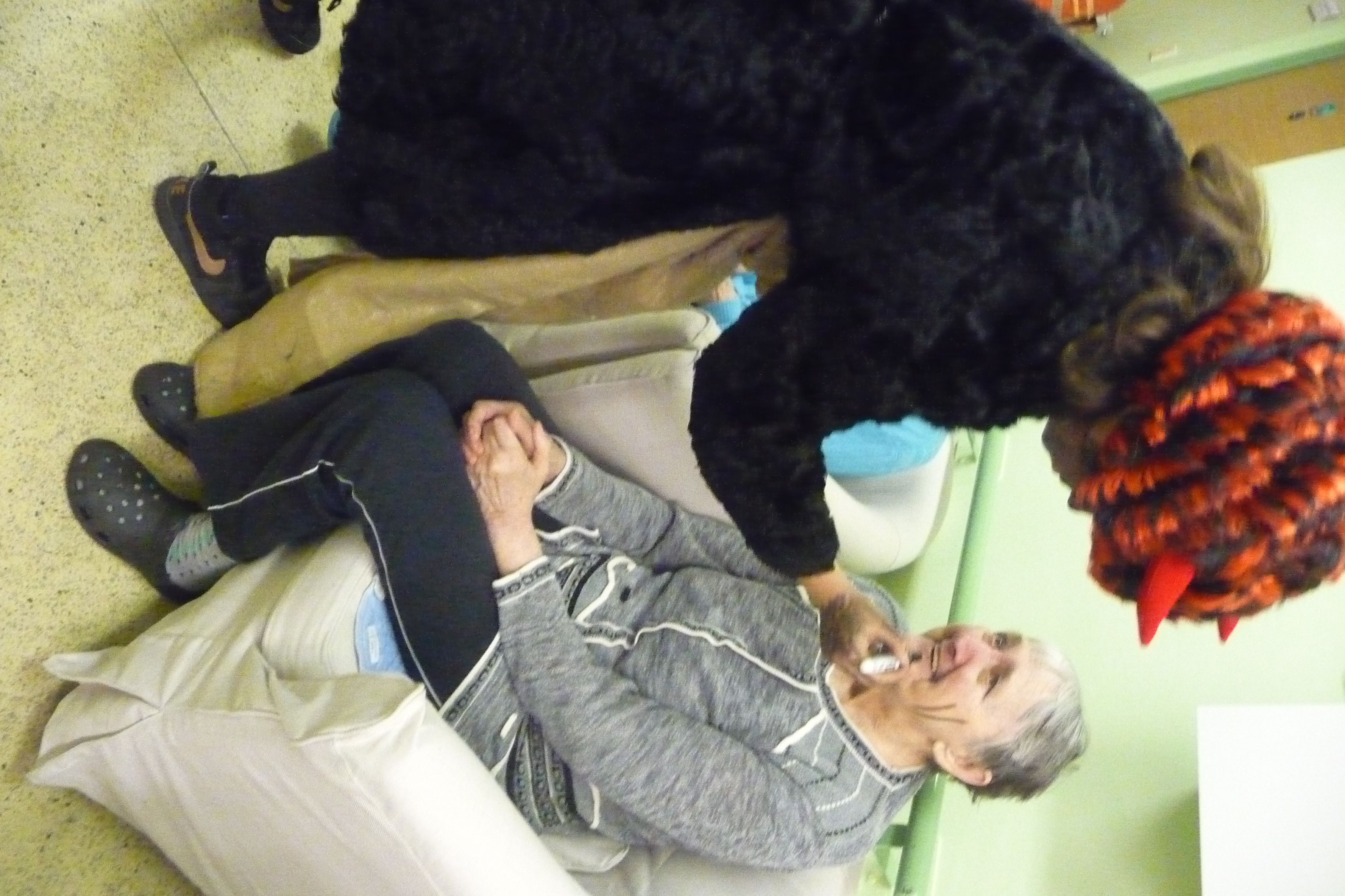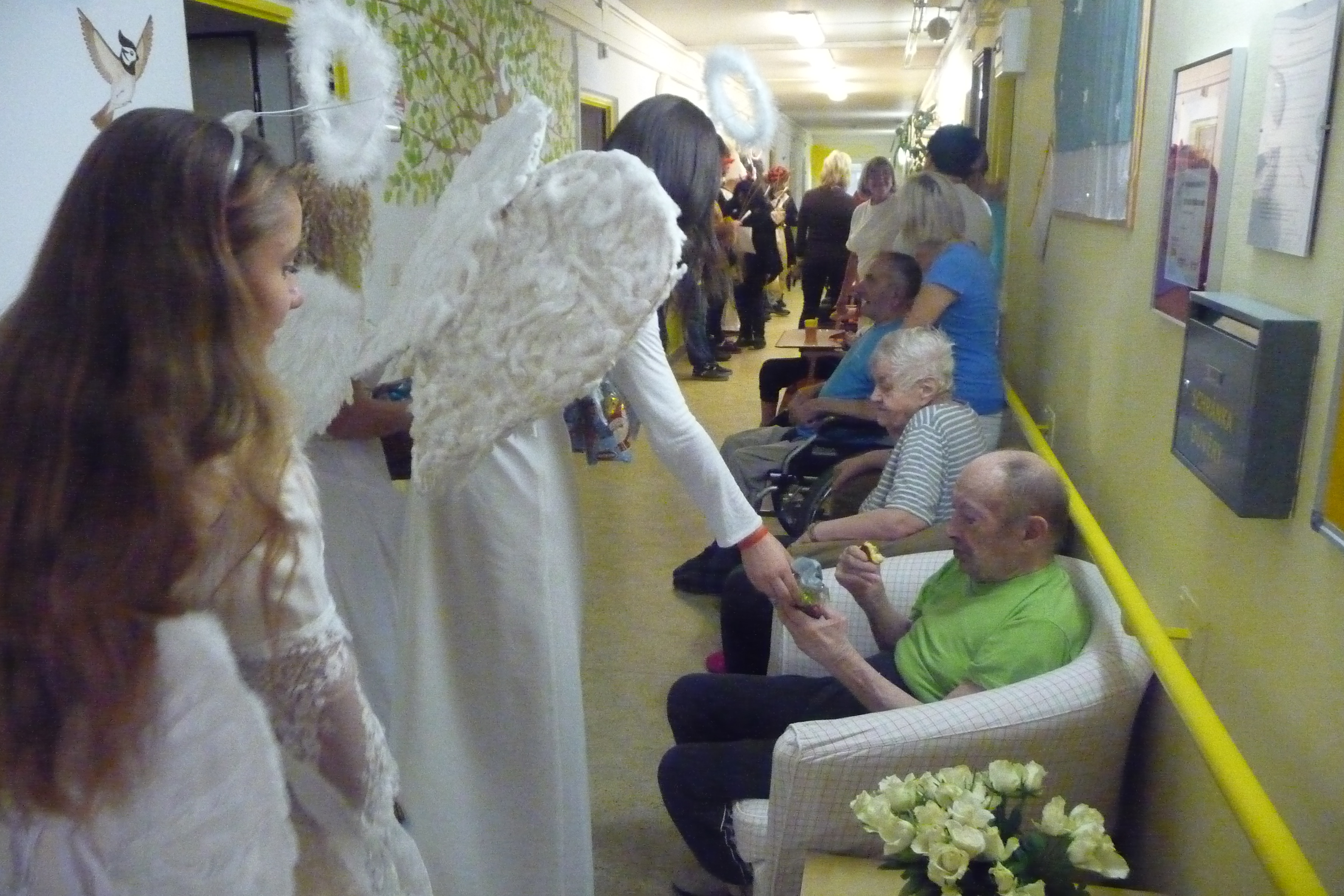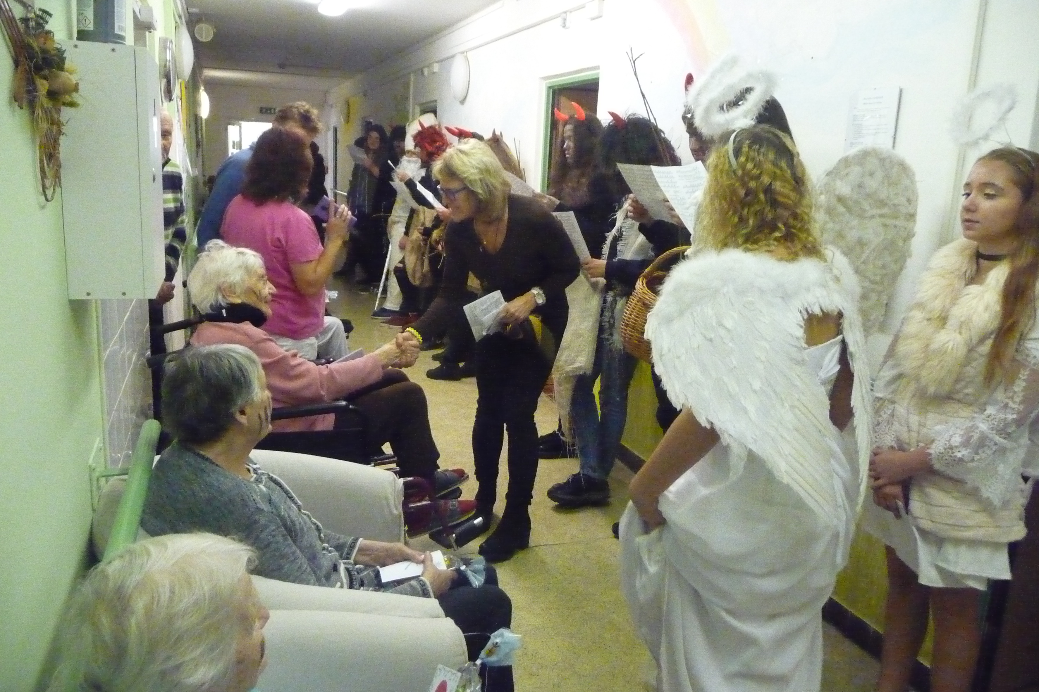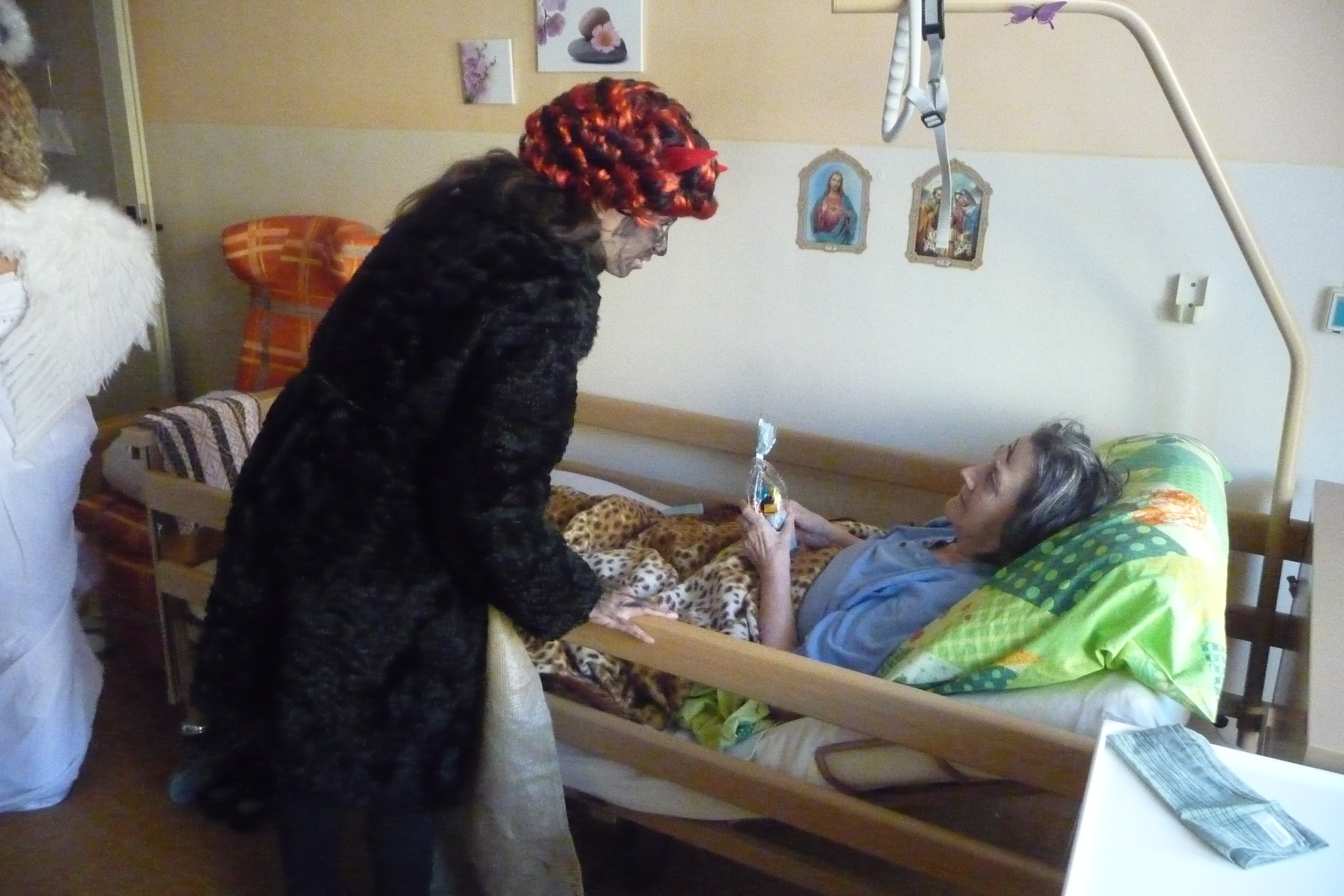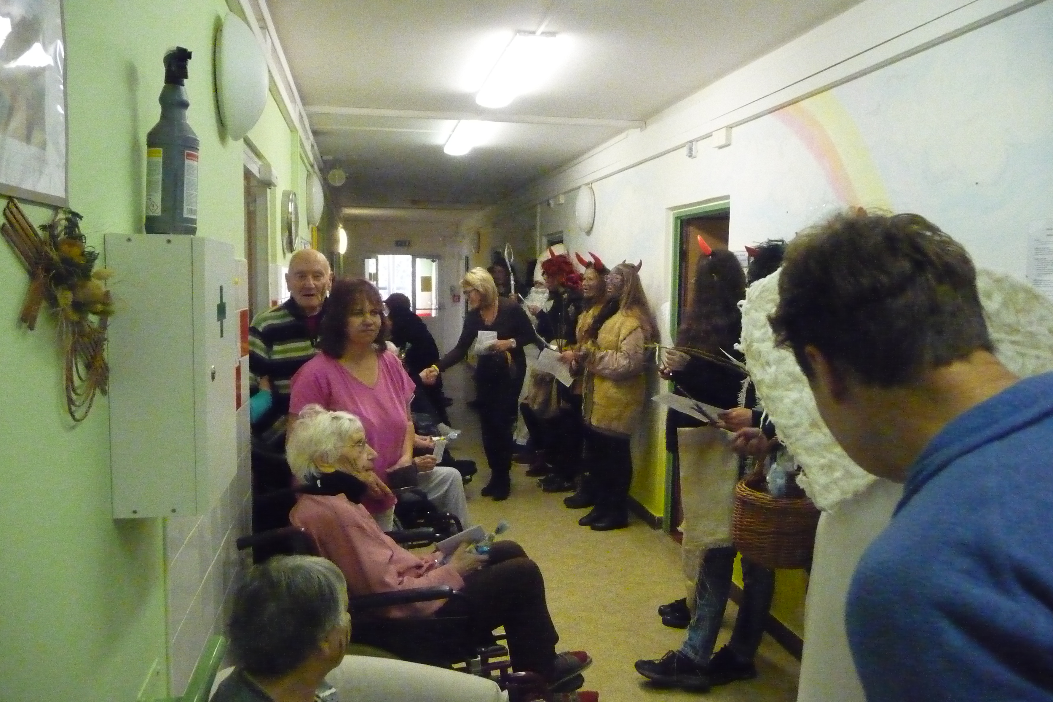 Jaký každý rok i dnes jsme se dočkali návštěvy těch, kterých se někteří velmi bojí :-) U nás tomu ale tak nebylo! V celém domově všichni čekali na průvod čertů a andílků v čele s Mikulášem. Dvě skupiny zamaskovaných žáků devátých tříd ze ZŠ Dr. Fr. L. Riegra prošly celý dům, zastavili se u každého, popřáli krásné svátky, předali balíček s dobrotami a vlastnoruční přáníčko. Navštívili také ty, kteří je nemohli vyhlížet na chodbě. Celý průvod provázeli veselé písničky a koledy...