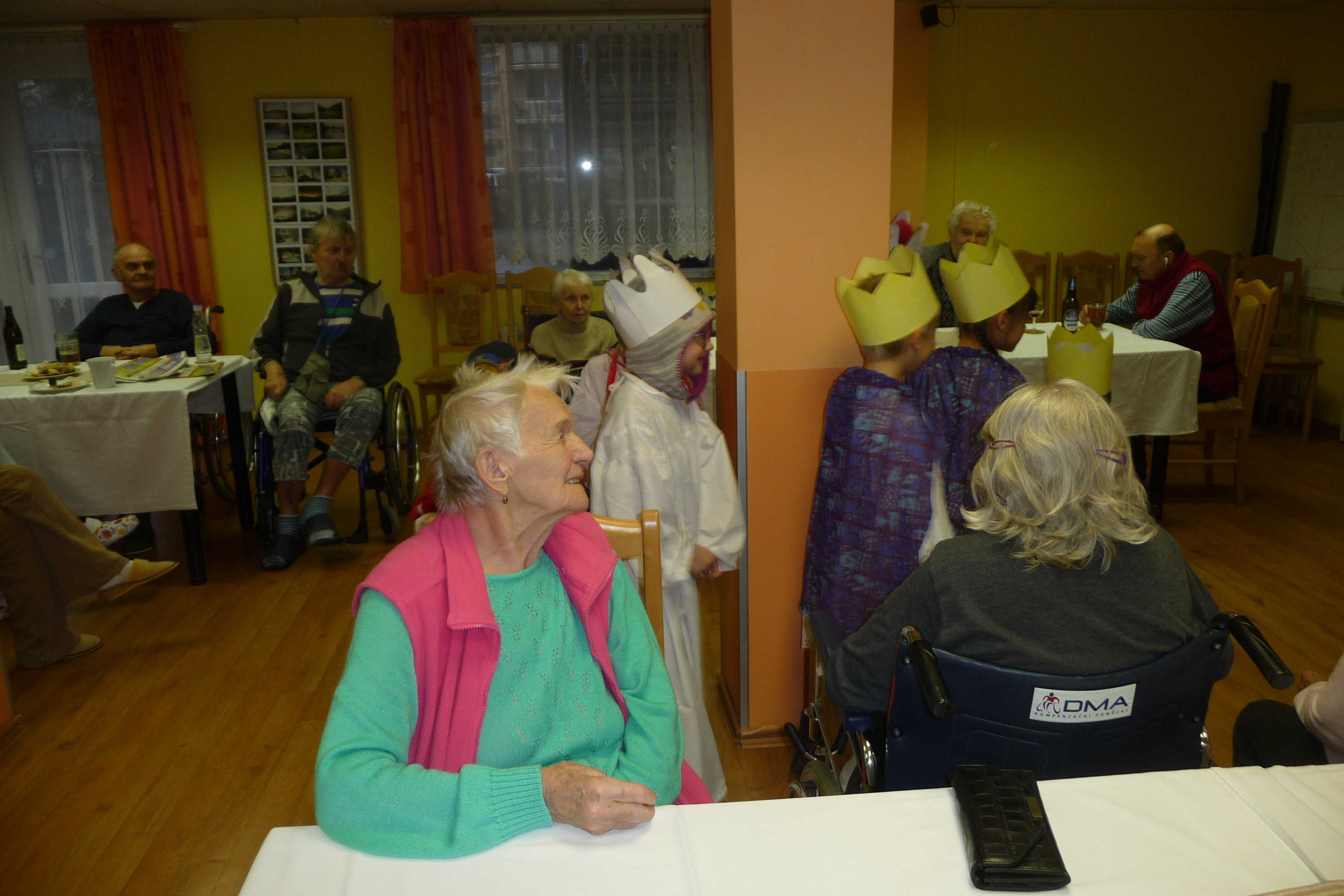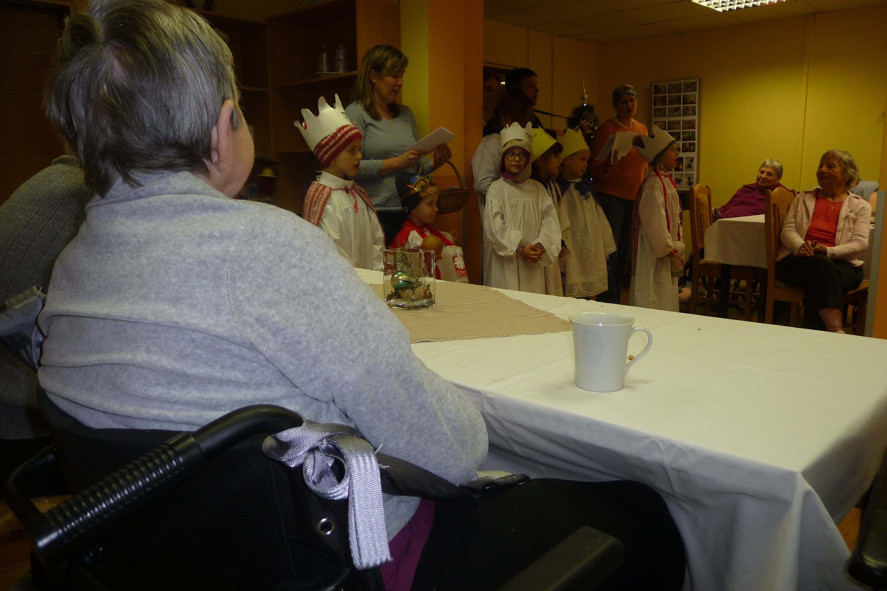 Ve čtvrtek 9. ledna u nás proběhla Růžová cukrárna a na konci posezení k nám přišli opět děti s tří královou sbírkou. Po několik koledách se rozešli mezi naše uživatele, kteří již měli přichystaný drobný peníz do kasičky malým koledníkům. Všichni můžou pomoci.